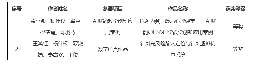 其中,蓝小燕教师团队《以AI为翼,焕活心理课堂——AI赋能护理心理学教学创新应用案例》凭借前瞻性的教学设计、显著的实践成效与精彩的现场答辩,荣获AI赋能教学创新应用案例组一等奖第一名。王鸿红教师团队的《针刺高风险腧穴定位与针刺虚拟仿真系统》,以高度的专业性与先进的技术融合,荣获数字仿真作品组一等奖第三名。两支团队的卓越表现,充分展现了赛院教师扎实的专业素养与勇于创新的精神风貌。