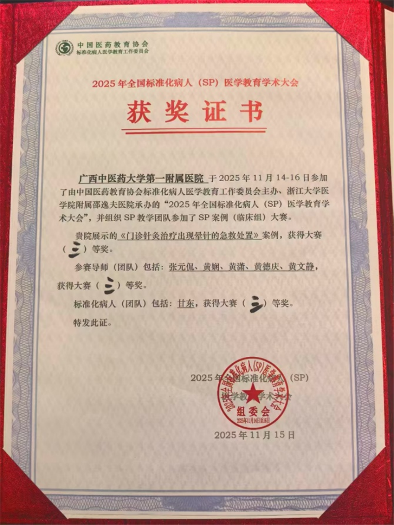 11月14日—16日,2025年全国标准化病人医学教育学术大会暨全国准化病人案例大赛在浙江大学医学院附属邵逸夫医院举办。经过激烈角逐,第一附属医院张元侃教师团队凭借出色表现,荣获全国标准化病人案例(临床组)三等奖。