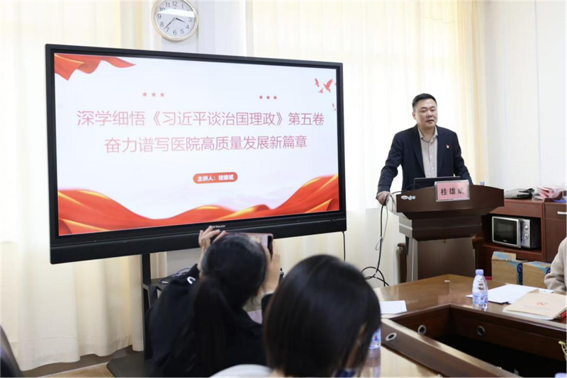 桂雄斌以《深学细悟<习近平谈治国理政>第五卷 奋力谱写医院高质量发展新篇章》为题讲授党课,从“深刻把握《习近平谈治国理政》第五卷的重大意义”“全面把握《习近平谈治国理政》第五卷的丰富内容”“系统掌握贯穿《习近平谈治国理政》第五卷的五大战略支柱”“知行合一,在推动医院高质量发展中彰显使命担当”四个方面,带领大家学习习近平新时代中国特色社会主义思想与时俱进、不断创新发展的最新理论成果。