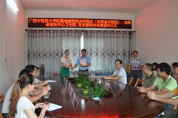 6月8日上午,瑞康医院田阳院区党支部与田阳县坡洪中心卫生院党支部结对共建签约仪式在坡洪中心卫生院举行,田阳县卫生和计划生育局副书记、副局长钟锦华,田阳院区党支部书记甘照儒、院长龙驹,中共田阳县坡洪镇委员会副书记、镇人大主席黄大国,坡洪中心卫生院支部书记、院长潘海兰等出席揭牌及签约仪式并作发言。