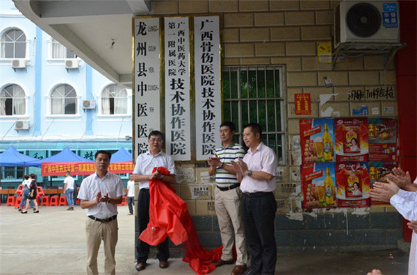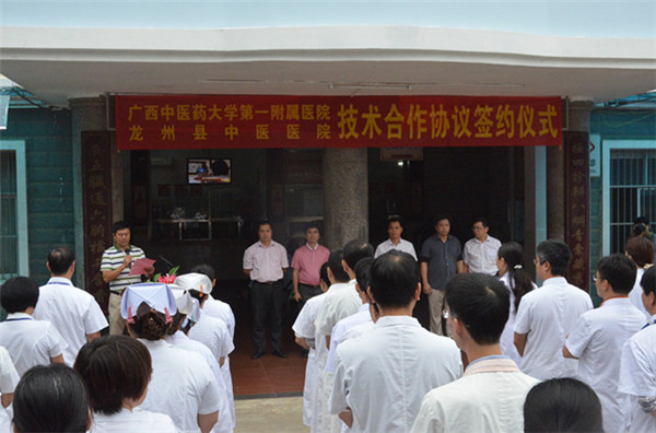 21日上午8点半,在龙州中医医院举行了简短而热烈的续签仪式。出席仪式的领导有龙州县县委常委、宣传部长、副县长何子华,我院副院长周建国,龙州县卫计局局长梁兆善,一附院院长助理、仙葫院区常务副院长黄仲海,龙州县中医医院院长吕干。梁兆善主持了仪式。吕干在致辞中谈到,近年来在一附院的帮助下,龙州县中医医院的专业技术水平得到很大提高、业务发展迅速,迫切希望能够与我院开展更深层次的合作与交流;周建国重点介绍了仙葫院区的总体情况、发展定位和远景展望,同时还表达了进一步帮扶龙州基层中医药发展的诚意,对两院未来的合作前景充满信心。何子华代表龙州县委县政府及广大群众,感谢一附院对边城龙州基层医疗发展的无私帮助;他高度肯定了两院在基层专科专病建设、人才培养工作中取得的合作成果,并希望采取互派人员任职等方式进一步加大人才培养力度;要求两院积极研究、稳步推进分级诊疗工作,同时坚持发挥中医药的特色与优势,让更广大患病群众受益。周建国和吕干续签了技术合作协议,以上领导一同为“星空彩票老版本下载第一附属医院技术协作医院”揭牌,一附院专家团队和龙州县中医院全体职工共同见证。