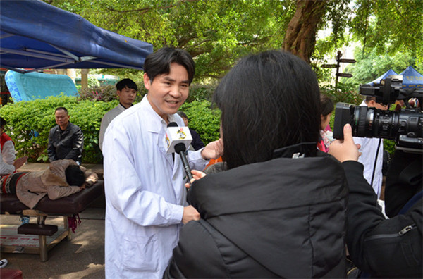 “本次我们来到社区给居民们进行义诊宣传活动,主要让居民能够认识推拿、了解推拿。推拿不仅可以治疗疾病,推拿还可以保健养生”、“‘华佗五禽戏’养生功法能使人动作灵敏、协调平衡,改善关节功能及身体素质,是一种切实可行的、适合大众养生健身的运动”、“小儿推拿根据小儿的生理和病理特点,在小儿体表特定的穴位或部位施以手法,对于新生儿黄疸、新生儿夜啼、新生儿吐奶、新生儿肠痉挛、新生儿腹泻等,效果很好,优于其他疗法”。推拿科副主任雷龙鸣博士在接受广西电视台记者采访时如是说。据了解,本次活动是由广西电视台影视频道权威健康养生节目《健康老友道》主办,该节目自今年开播以来,多次邀请一附院各科室的主任、专家为群众录制健康养生专题节目,目前已邀请了一附院30多名专家录制70余期节目,一附院专家在节目中倡导的养生小窍门和传播的健康知识得到广大观众的认可和支持。