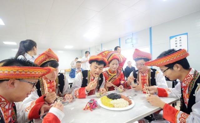 员工身着壮族服饰品尝五色糯米饭