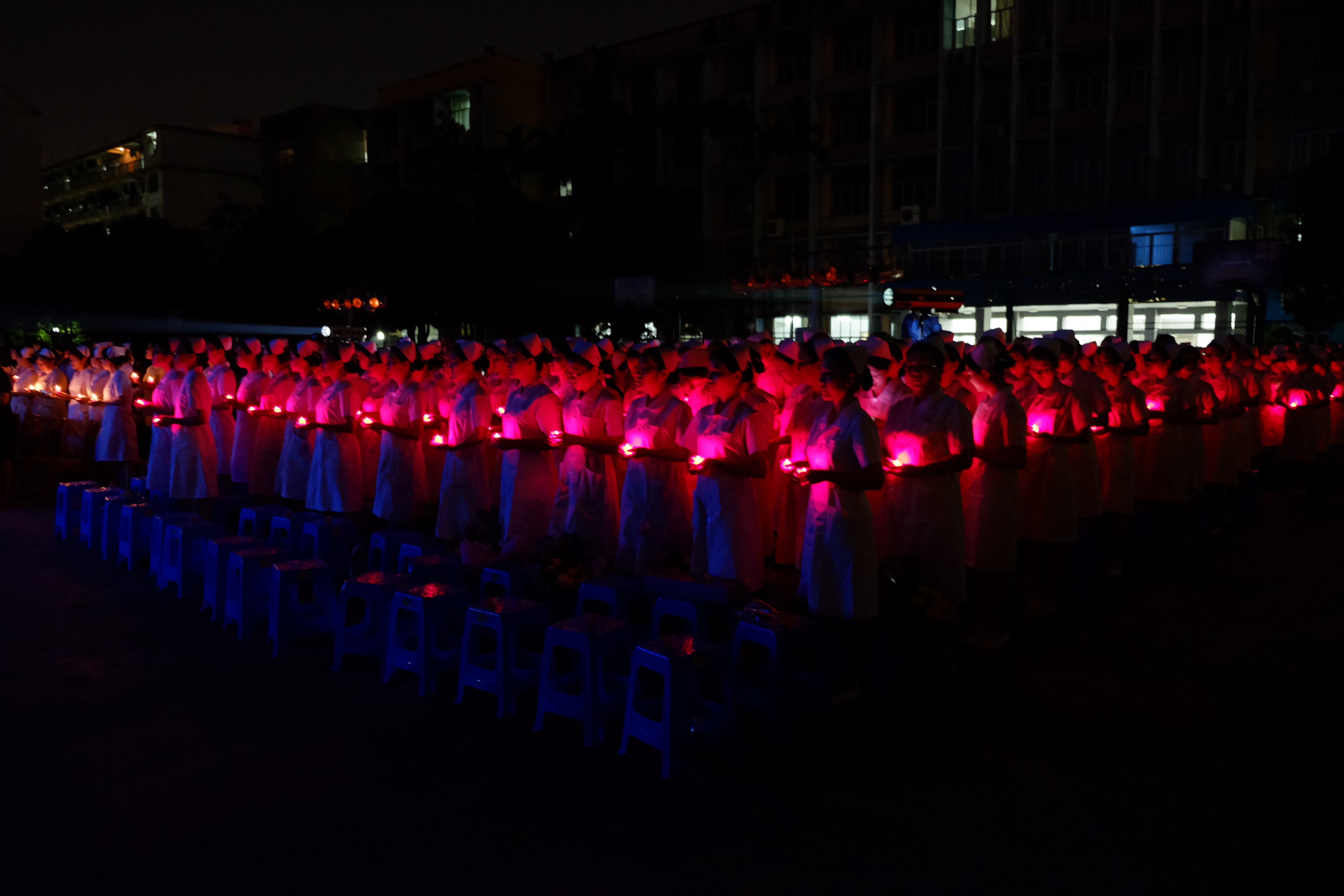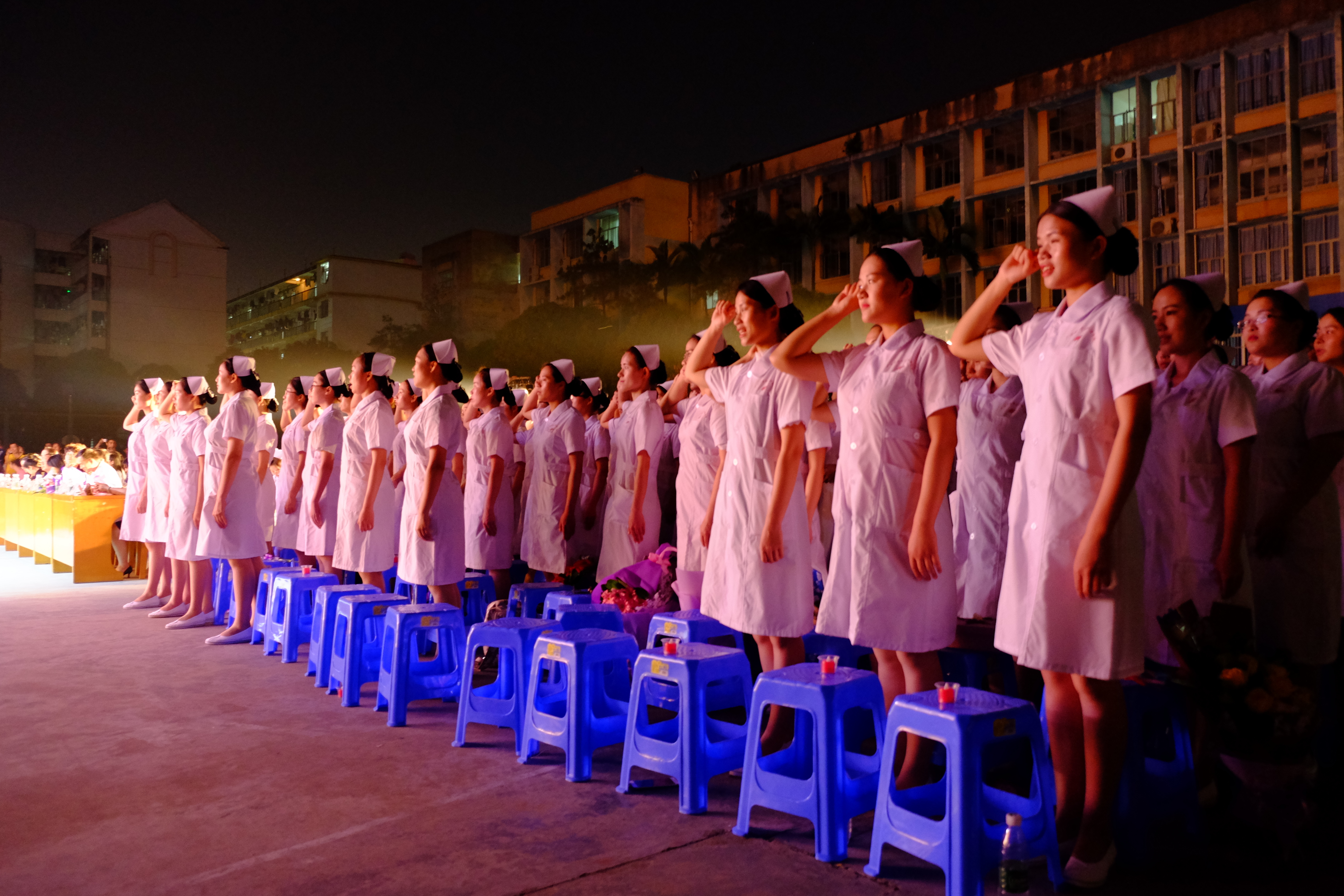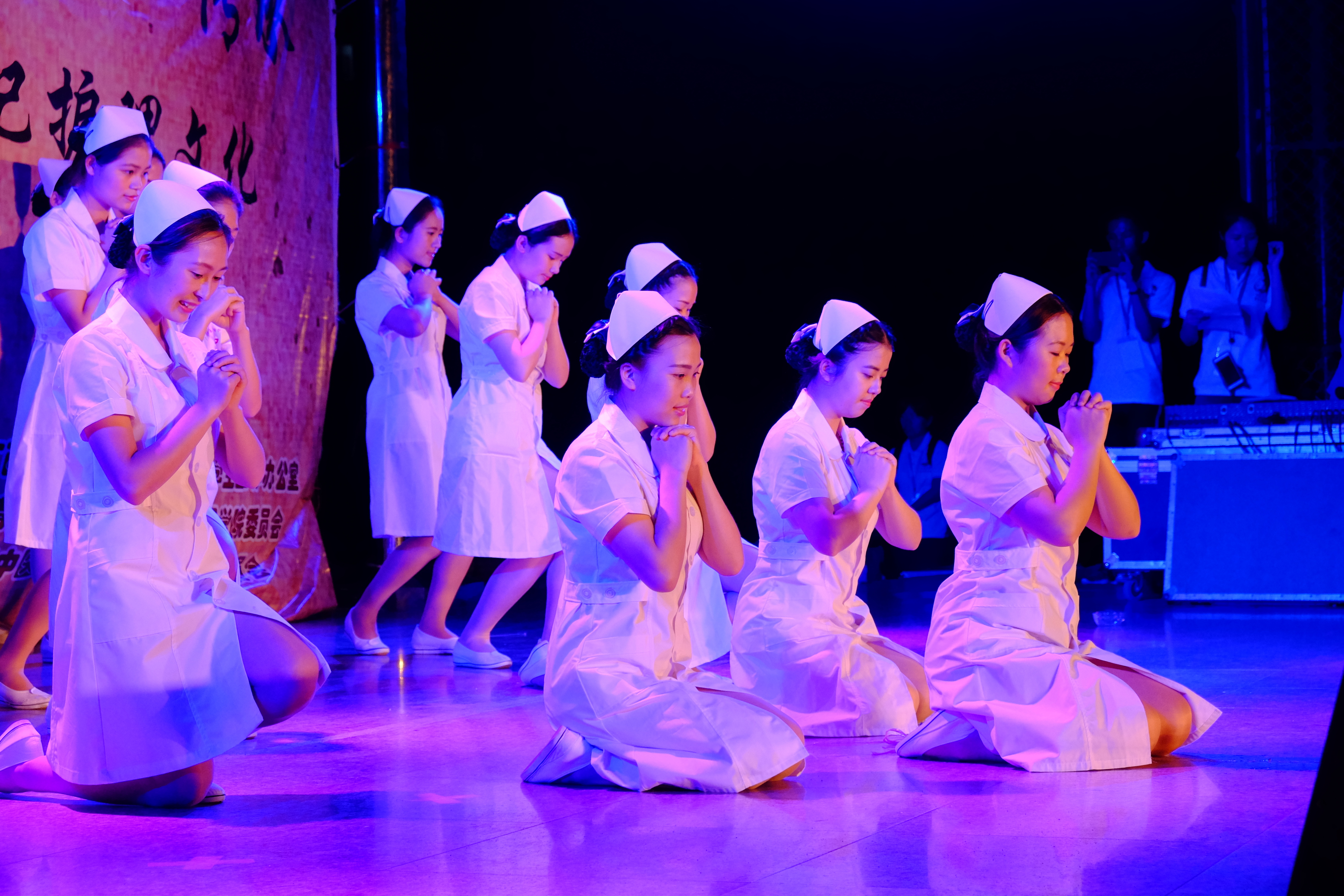 在温暖的烛光下,同学们身着洁白的护士服,戴着燕帽深情表演手语舞蹈《感恩的心》。她们每一个眼神、微笑、动作感染着在场的每一个人。仿佛用坚定的信念传达出:我们会尽职尽责关爱每一位病人,救死扶伤为己任,我们时刻准备着。