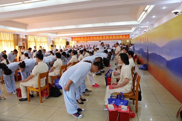 与会领导共同为第七、八期的指导老师代表颁发了聘书并举行了古朴庄重的拜师仪式。指导老师代表刘燕平教授和学员代表全浪方同学分别发言。所有学员齐诵拜师贴、向老师三鞠躬、敬茶,表达了对学校和老师的虔诚的感恩之情。