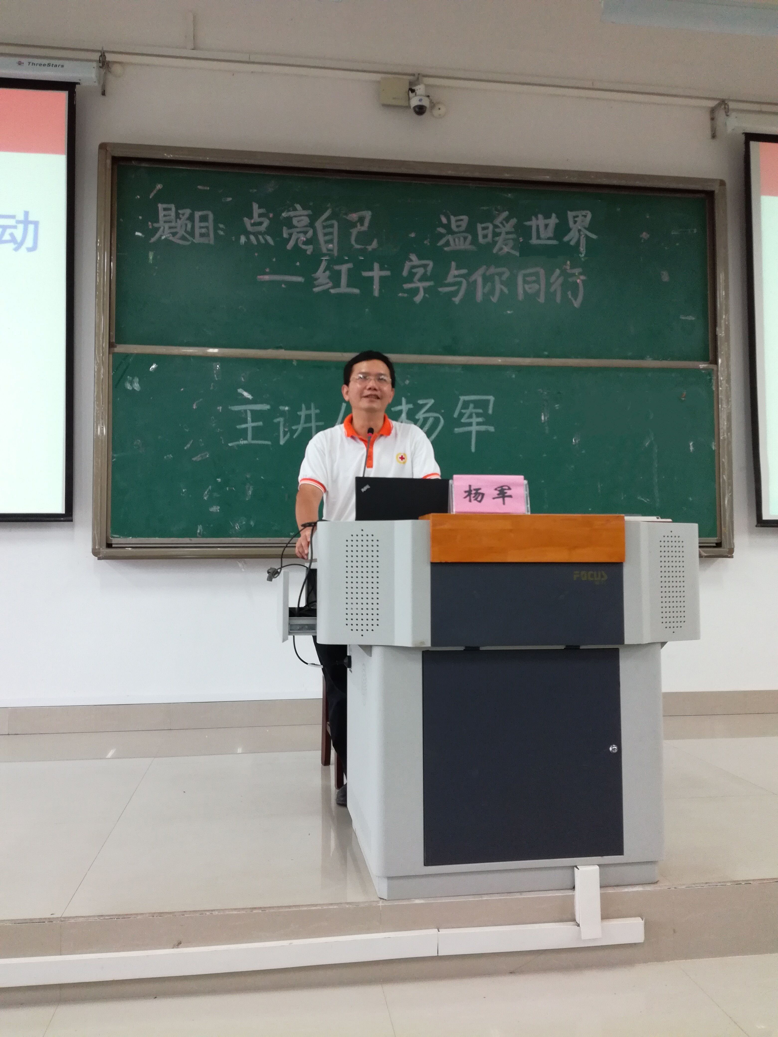 揭牌仪式正式开始前,杨军为我校的志愿者们开展了《点亮自己、温暖世界---红十字与你同行》的主题讲座,主要讲述了红十字运动的起源、标志、基本原则,以及中国红十字事业、国际人道法等。早上10:30,老师及志愿者来到了大学生活动中心的红十字会文化传播基地,举行揭牌仪式,历时半年多筹备的文化基地建设正式完成,标志着红会作为红十字文化传播使者征程的新开始。揭牌仪式完成后,两位区会老师给红会的骨干们进行工作指导并提出许多建议。