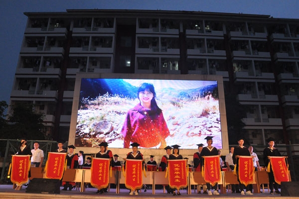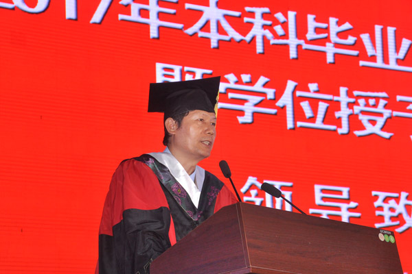 董塔健宣读了优秀毕业生的表彰决定。主席台上的领导为受表彰的毕业生们颁发学院优秀毕业生锦旗,并为2017年毕业生代表授予学士学位。
