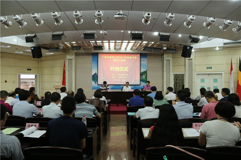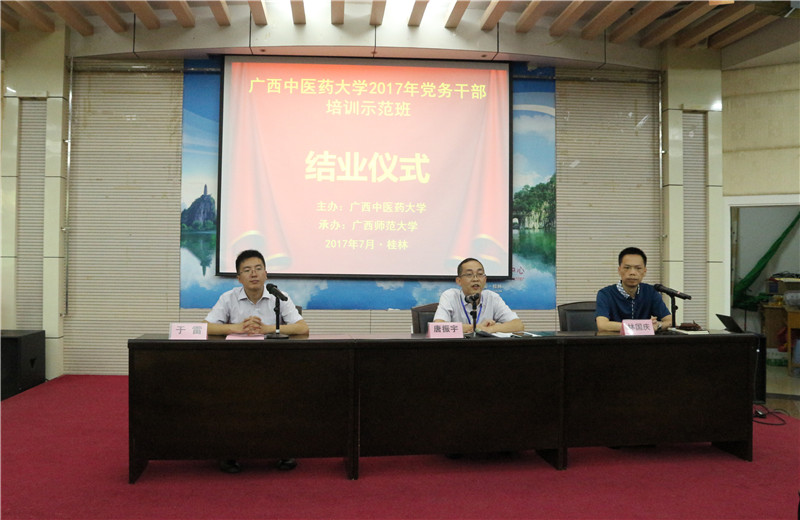 为了扎实推进我校“两学一做”学习教育,深化巡视整改,加强我校党务干部队伍和基层党组织建设的需要。2017年7月6日~9日,我校2017党务干部培训班在广西师范大学举办。此次培训班由我校主办、广西师范大学承办,来自学校各院(系)级党委(总支)书记、党支部书记代表、学校党务部门负责人共56人参加了此次培训。广西师范大学党委副书记赵铁,我校党委副书记董塔健出席了开班仪式并讲话。