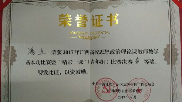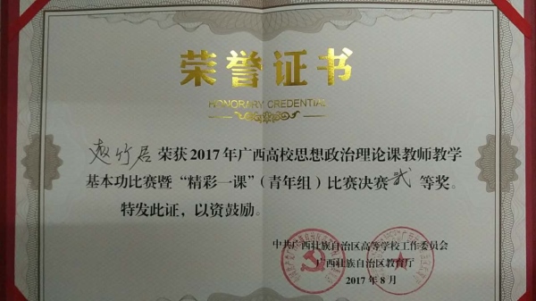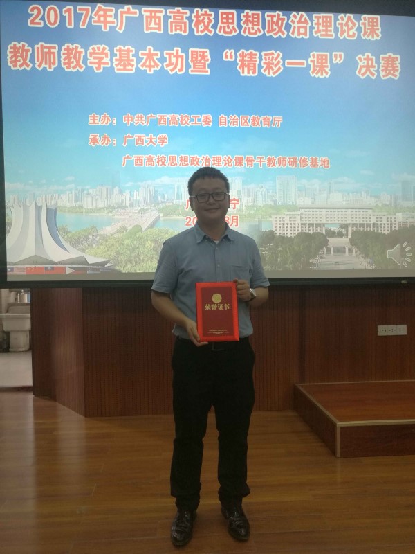 8月30日,2017年广西高校思想政治理论课教师教学基本功暨“精彩一课”比赛在广西大学马克思主义学院落下帷幕。我校潘立老师荣获青年组一等奖、赵竹君老师荣获青年组二等奖。