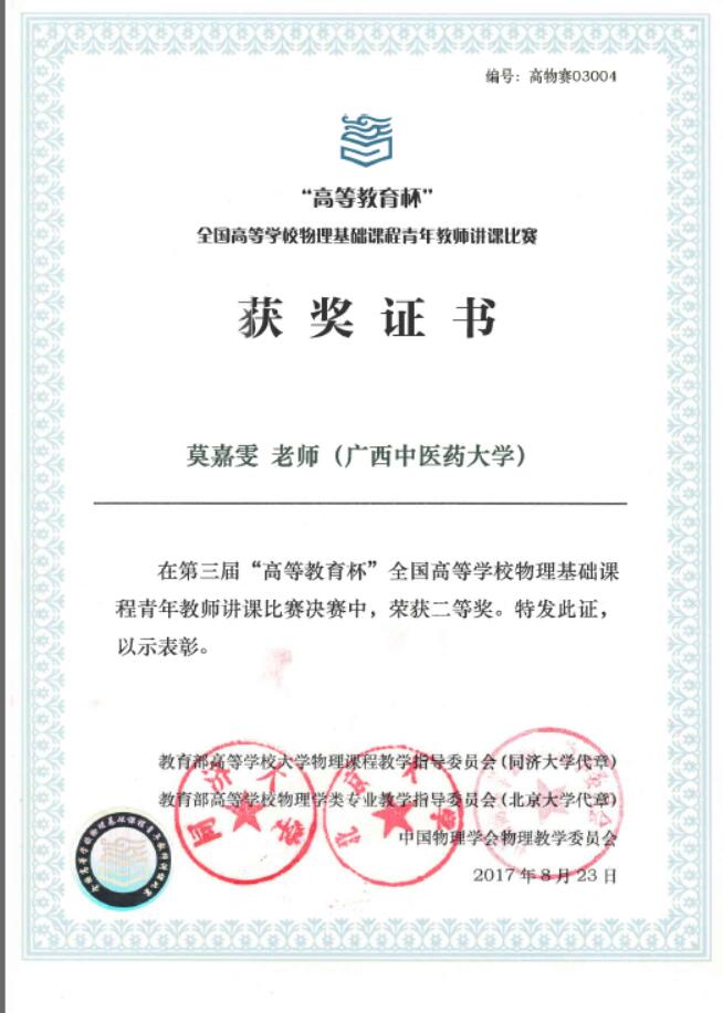 药学院莫嘉雯获“2017年全国高等学校基础物理课程青年教师讲课比赛”全国总决赛二等奖