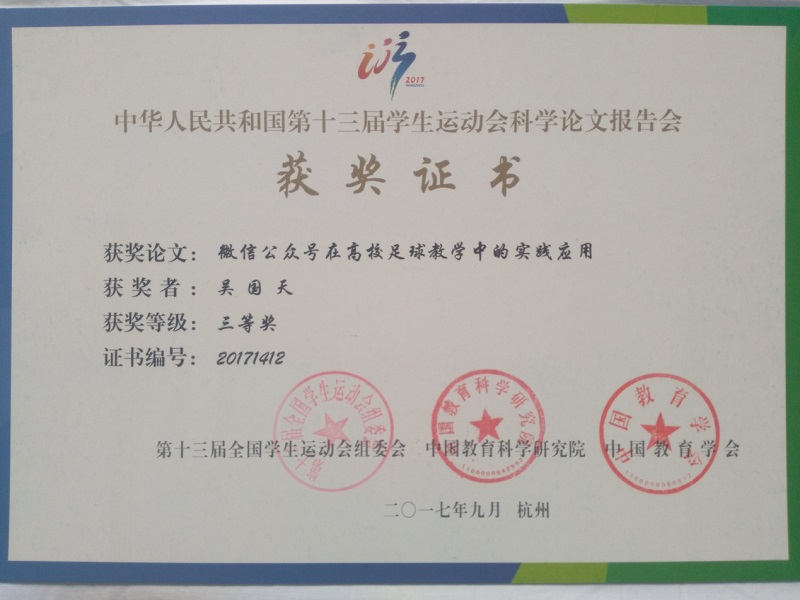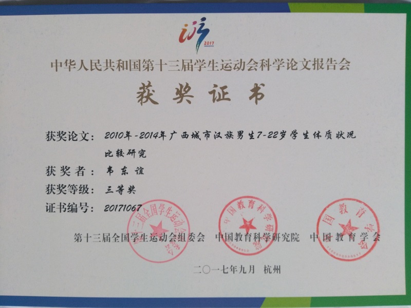 近日,由教育部、国家体育总局、共青团中央主办,浙江省人民政府承办,中国教育科学研究院、中国教育学会全国高等学校体育教学指导委员会、全国中小学体育教学指导委员会协办的第十三届全国学生运动会科学论文报告会在浙江工商大学举行。我校体育部韦东谊老师报送的论文《2010年-2014年广西城市汉族男生7-22岁学生体质状况比较研究》紧跟学生体质健康的热点问题,数据全面,分析到位,观点独特;吴国天老师报送的论文《微信公众号在高校足球教学中的实践应用》紧抓校园足球和互联网+当前这一最热门的学校体育研究课题,有理论分析,有实践应用,两位老师同获三等奖,我校论文获奖数量名列广西高校第二位。
