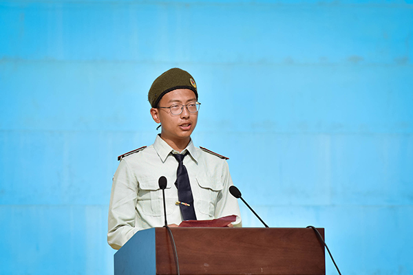 瞿胜雄表示,同学们在军训中吃苦耐劳、严于律己、顽强拼搏、表现出色。希望通过此次军训,同学们能普遍增强体质,磨练自己的意志,锻炼抗挫品质,培养团队协作精神。接着新生军训代表武宏伟同学也做了发言,他表示军训让他受益匪浅,他将在以后的学习中继续发扬军人精神,好学习,做一名合格的大学生。