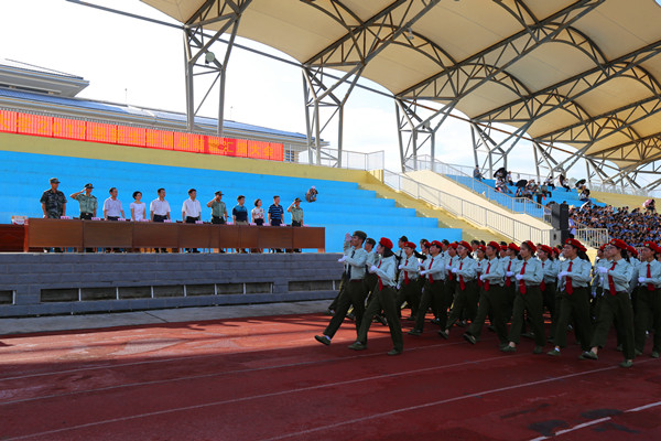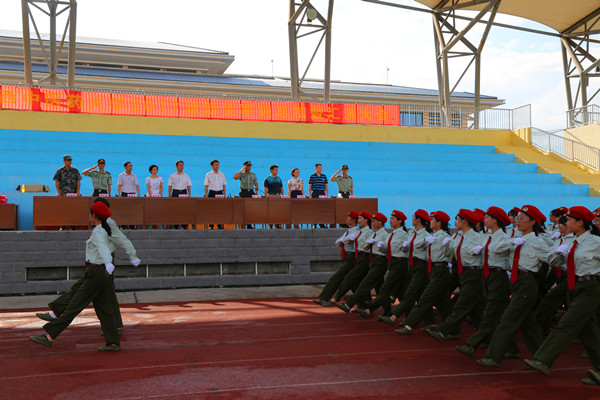 在雄壮的国歌声中,大会拉开帷幕。董塔健在农浩的陪同下检阅了参训学生,经过刻苦训练,同学们精神振奋,士气昂扬,“为学校争光”的口号响彻校园。随后,参训学生方队迈着整齐的步伐,喊着响亮的口号,伴随着雄壮的军乐,迈着坚定的步伐,精神抖擞地通过主席台。分列式结束后,参训学生方队在教官的指挥下,分别进行了臂腿功、捕俘刀表演、军体拳表演。参训学生斗志高昂、步伐整齐、口号嘹亮,全面展示了军训的丰硕成果和当代大学生朝气蓬勃、奋发向上的精神风貌,赢得了在场师生阵阵掌声。