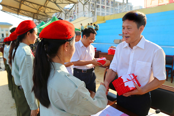 2017年9月23日下午,我校2017级新生军训汇报表演暨总结表彰大会分别在仙葫校区、明秀校区举行。学校党委副书记董塔健、2017级新生军训团团长农浩少校及相关部门的领导出席了这次大会。总结大会由学校武装保卫部部长冯第林主持。