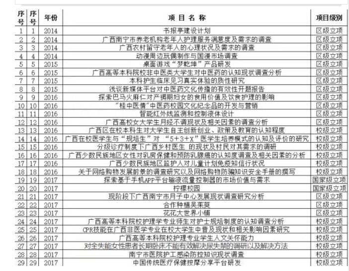 近三年来,护理学专业教师在教学科研方面取得了一批具有代表性研究成果。星空网页游戏官网研究立项课题共64项,其中广西高等星空网页游戏官网改革工程项目12项;校级精品资源共享课1门;获得自治区高等学校优势特色专业建设点1项、自治区创新创业教育改革示范专业1项;发表论文53篇;参与编写各级各类教材24部;荣获国家级教学成果一等奖1项、省级教学成果奖一等奖1项、二等奖1项,校级教学成果奖3项。其中,《养老服务业发展视角的“产教融合、公建民营”护理专业实体建设的研究与实践》荣获2014年国家级教学成果奖一等奖。