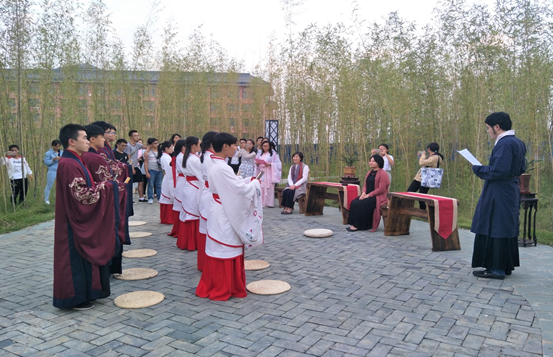 讲座结束后,兰风古琴社全体社员在学校竹林间举行了传统拜师仪式。朱行涛、刘布谷两位老师还对兰风古琴社进行了现场琴技指导。