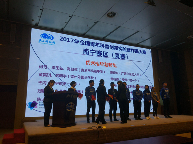 2017年12月10日,由中国科协科普部、共青团中央学校部主办,广西科技馆、广西青少年科技中心、共青团广西区委学校部承办的“SOLVE FOR TOMORROW探知未来”2017年全国青年科普创新实验暨作品大赛南宁赛区复赛,在广西科技馆圆满落幕。我校学生韦宥宇、杨志鹏、曾冰娴作品“云点滴智能输液系统”(指导老师:陈晓东)在比赛中取得优异成绩,获未来教育组一等奖及优秀指导老师奖,将赴北京参加全国决赛。