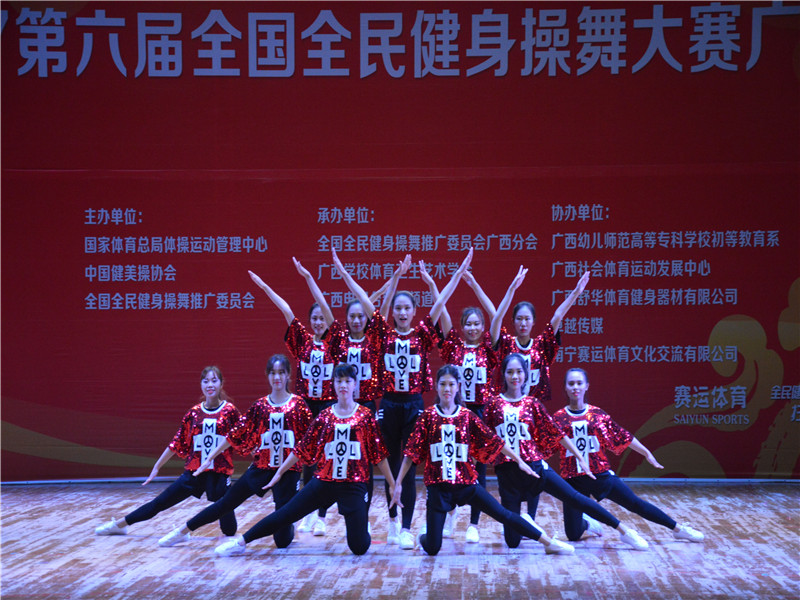 “2017第六届全国全民健身操舞大赛广西赛区”于12月16-17日在广西南宁隆重举行。本次大赛由国家体育总局体操运动管理中心、中国健美操协会、全国全民健身操舞推广委员会主办,全国全民健身舞推广委员会广西分会承办,比赛历时两天,共有88个参赛单位2500余人次参赛。我校体育部主任李荣源为领队,唐莹老师为主教练,王佳佳、曾雨涵等11位选手参加本次比赛。