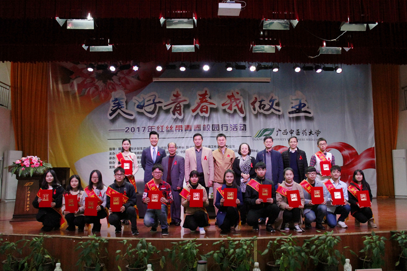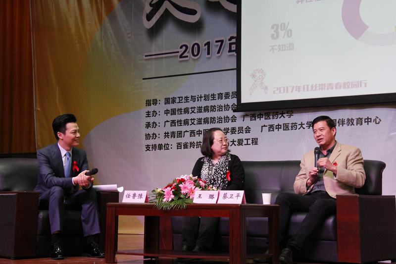 红丝带健康大使、中央电视台主持人任鲁豫,中国疾控中心性艾中心健教室主任王璐,广州市第八人民医院感染病科主任蔡卫平,自治区卫生与计划生育委员会艾救处处长陆庆林,广西性病艾滋病防治协会秘书长黎学铭,广西疾病预防控制中心艾滋病防治所所长沈智勇、我校党委副书记何并文和校团委书记王春花出席了本次活动。