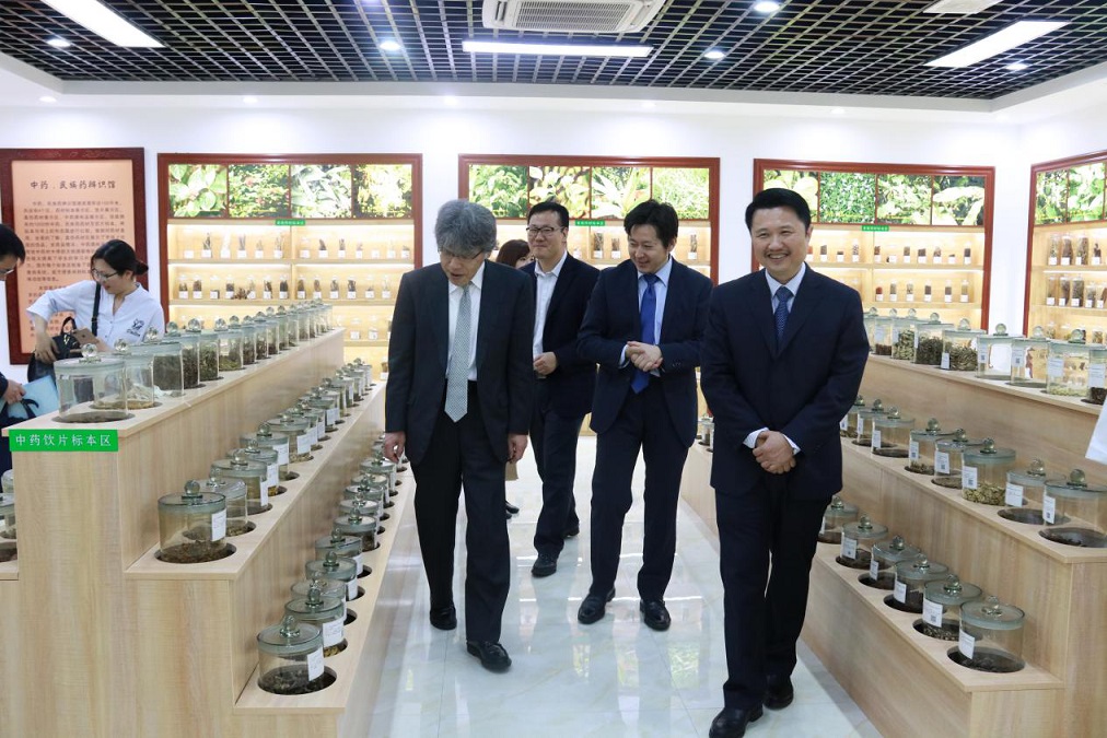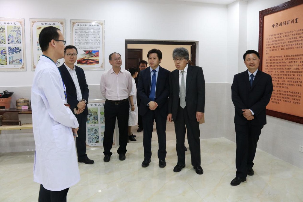 在庞宇舟的陪同下,柴原直利一行还实地考察了药学院中药(民族药)资源与辨识实训平台、中药炮制实训中心、GMP车间、壮医药成果展以广西中医药科学实验中心等。