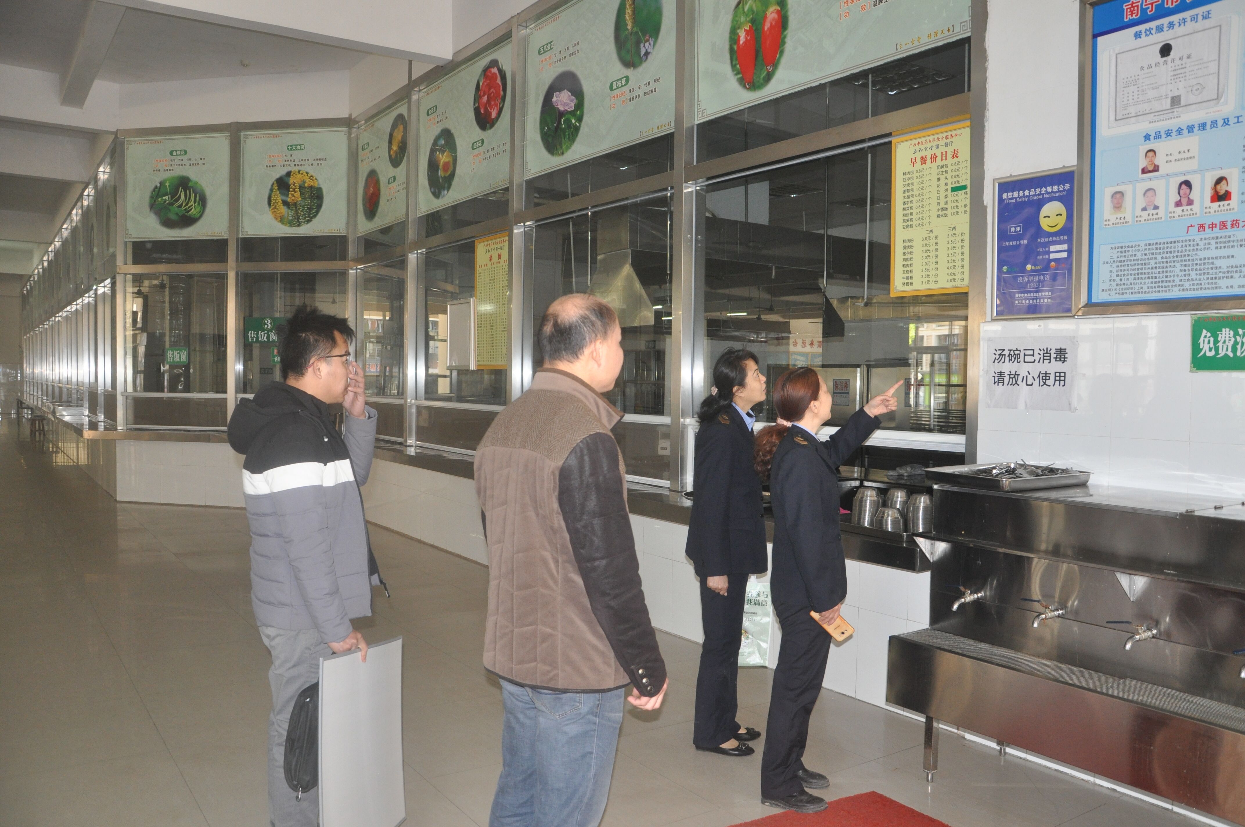 3月9日上午,青秀区食品药品监督管理局责宣传工作的熊淑芬科长等一行工作人员到我校仙葫校区开展关于“创建国家食品安全城市”的宣传工作,熊淑芬一行对我校五和食堂进行了食品卫生安全检查,对五和食堂各餐厅和食堂档口的食品安全卫生工作给予了高度的肯定,并给五和食堂颁布了A级服务机构的公示牌。