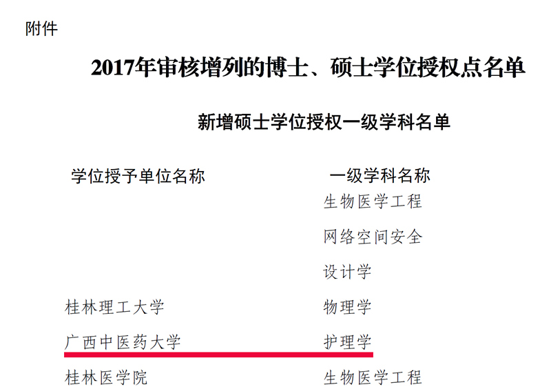 【喜讯】我校获批护理学一级学科硕士学位授权点 来源:学科建设办公室 作者:李曼莉 日期:2018-03-27 点击数: 次 分享到: 根据《国务院学位委员会关于下达2017年审核增列的博士、硕士学位授权点名单的通知》(学位〔2018〕9号),我校护理学增列为硕士学位授权一级学科。至此,我校有中医学、中药学、中西医结合、药学、临床医学、护理学6个硕士学位授权一级学科。链接:国务院学位委员会关于下达2017年审核增列的博士、硕士学位授权点名单的通知 打印正文 关闭本页