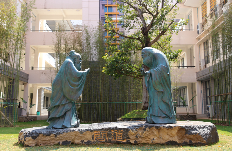 春暖花开,惠风和畅,大型青铜雕塑作品《问道》在星空彩票老版本下载仙葫校区落成。该作品由广西美协主席、我国著名雕塑家石向东教授及其团队创作。《问道》匠心独运地表现了老子、孔子两位中国先圣会晤的形象。这一向中国传统文化两座高峰致敬的作品伫立于学校教学楼西侧,成为我校新的人文景观、一抹夺目的亮色。