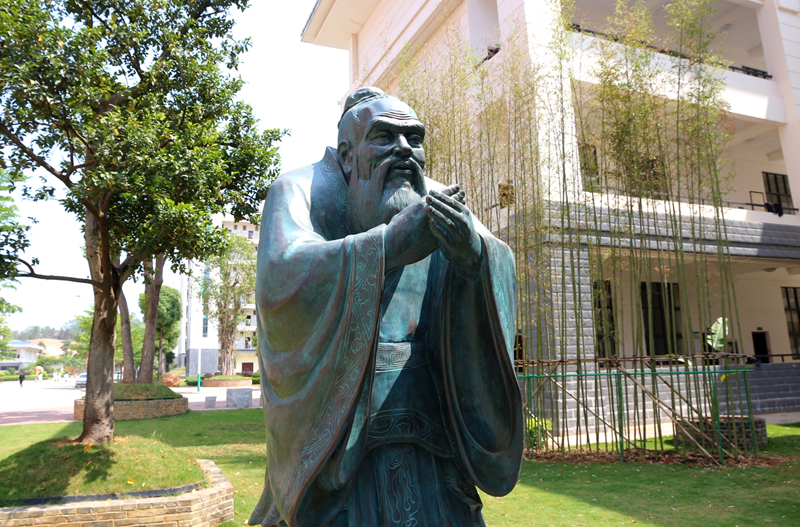 《问道》主题雕塑重现了“孔子问道于老子”求知若渴,不懈追求的一幕。《问道》中的孔子打拱作揖,弥散着礼敬与谦和,展现出儒家仁礼、仁爱为本的道德追求;老子则造型奇崛,神采飘逸,体现出道家道法自然、虚怀若谷的希夷气象。《问道》雕塑形神兼备,栩栩如生,佐以周围绿竹猗猗,春阳朗照,化现出中华传统文化天人合一、礼用和贵的至高境界。睹斯像威仪,使人长史澄照,文思萦怀……