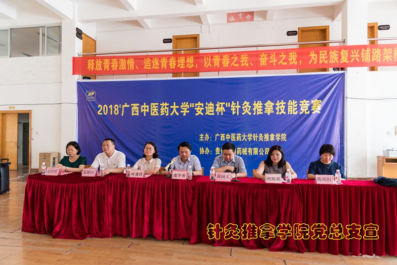 5月8日下午, 我校2018年 “安迪杯”针灸推拿技能竞赛在明秀校区体育馆举行。学校党委副书记庞宇舟教授出席活动开幕式并讲话,贵州安迪药械集团有限公司副总经理何顺莉女士,学校相关部门以及针灸推拿学院全体老师出席了竞赛开幕式。