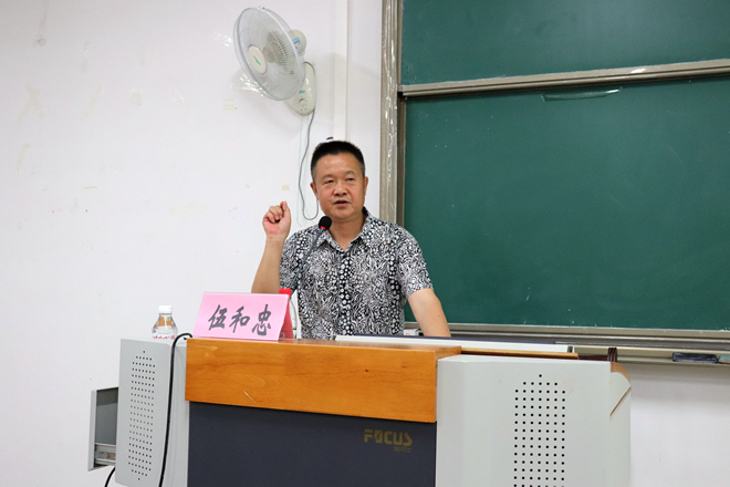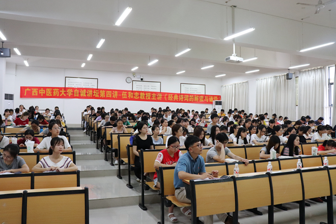 2018年5月18日,由广西师范学院教授、硕士研究生导师、国家级普通话水平测试员、广西语言协会副会长伍和忠主讲的自诚讲坛第四讲——《经典诗词的解读与诵读》在仙葫校区教学楼1-305举行。校团委办公室主任、社会实践部部长(合署)陈晓东出席本次讲座,讲座现场座无虚席。