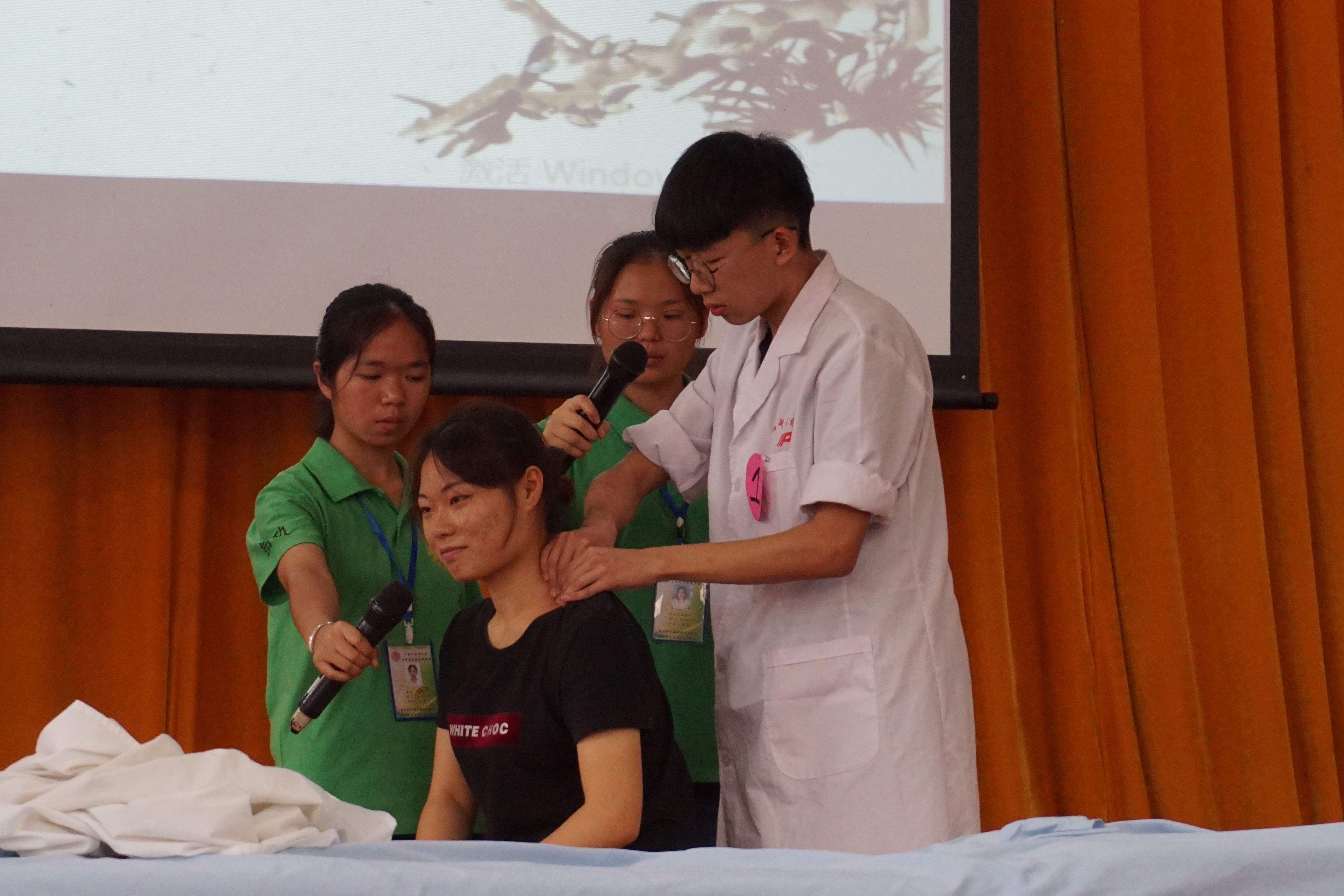 5月 20日上午,决赛在我校大学生活动中心小礼堂举行,由星空彩票老版本下载第一附属医院推拿科副主任何育风、广西中医药学会推拿专业委员会常务委员甘炜担任评委,并有幸邀请到我校团委办公室主任、社会实践部部长(合署)陈晓东莅临现场。