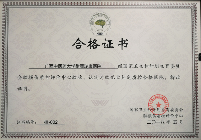 国家卫健委脑损伤质控评价中心常务主任宿英英等专家组一行四人对瑞康医院开展了材料审核和实地验收,认定验收合格后,与医院签署了《脑死亡判定质控协议书》,并颁发了《脑死亡判定质控合格医院》证书。瑞康医院成为全国第一所通过脑死亡判定质控合格医院验收的中西医结合医院,也是全国中医系统中获得合格验收的第二家。