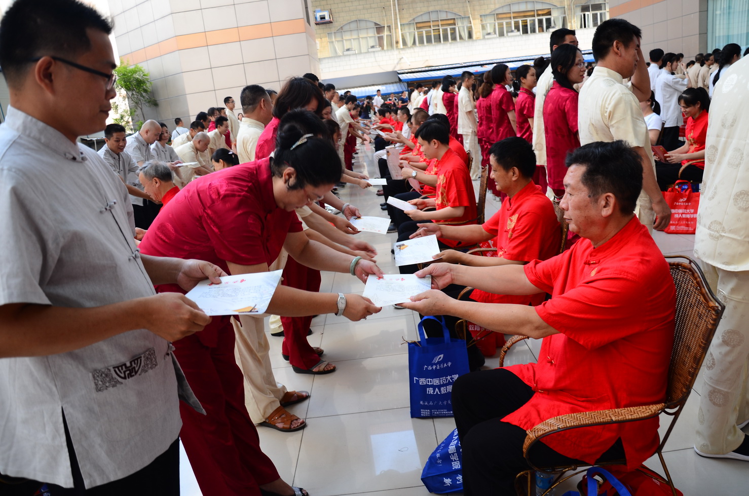 自治区中医药管理局中医民族医医疗处黎甲文处长,我校副校长冷静,直属党委书记、成人教育学院院长韦艾凌, 直属党委副书记、成人教育学院副院长覃振林,成人教育学院副院长黄瑞诚,以及学校直属附属医院的相关领导、师承班指导老师和学员代表共300余人参加了拜师仪式。