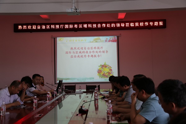 6月7日,自治区科技厅国际与区域科技合作处、中国-东盟技术转移中心、广西电台北部湾之声来我校开展2018年“百名东盟杰出青年科学家来华入桂工作计划” (以下简称东盟杰青入桂计划)项目的系列宣讲活动。学校科技处、各学院和附属单位领导、重点实验室代表及广西科技重大专项代表等20余人参加会议。本次会议由科技处副处长王孝勋主持。