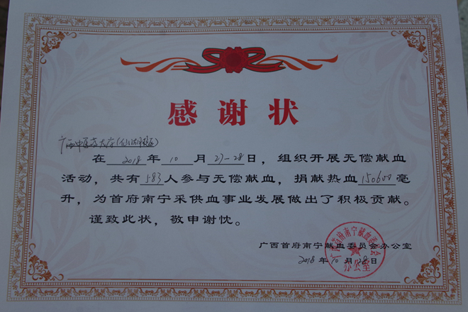 10月27至28日,我校红十字会联合南宁中心血站开展了以“你我付出,牵动他人”为主题的无偿献血活动,共计583人参与其中,捐献热血达150600毫升。