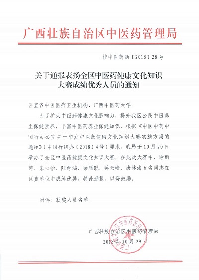 我校在全区中医药健康文化知识大赛中喜获佳绩 来源:教务处 作者:教务处 日期:2018-11-05 点击数: 次 分享到: 日前,广西壮族自治区中医药管理局通报表扬在全区中医药健康文化知识大赛中成绩优秀人员,我校谢丽萍、朱心怡、陆源鸿、梁雁聪4名同学受到表扬。10月20日下午,由广西壮族自治区中医药管理局举办的全区中医药健康文化知识大赛在我校明秀校区举行,来自全区3所高等院校、27所医院的百余位学生及青年医师参加了此次比赛。学校选派了海选阶段表现优异的20名同学参加比赛。 打印正文 关闭本页