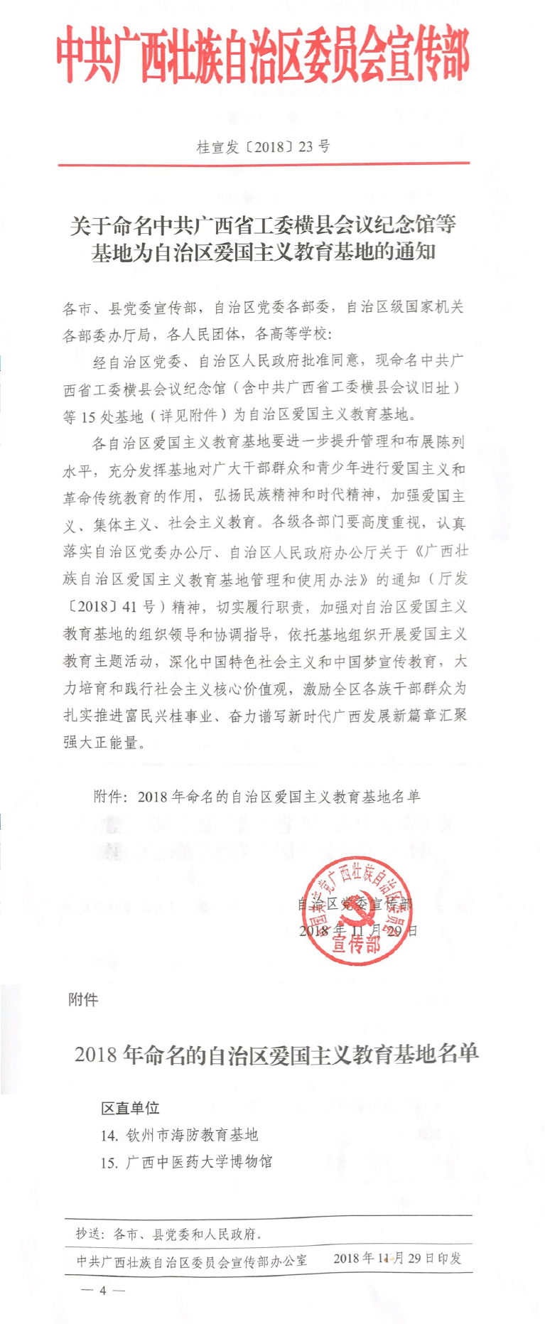 日前,经自治区党委、自治区人民政府同意,由我校党委宣传部、博物馆联合申报的星空彩票老版本下载博物馆被命名为第七批自治区爱国主义教育基地,同时被确定为爱国主义教育基地的还有中共广西省工委横县会议纪念馆等14处基地。