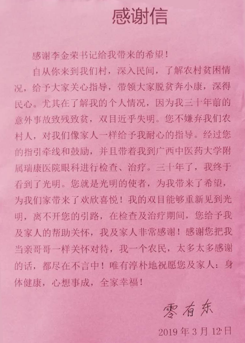 自从你来到我们村,深入民间,了解农村贫困情况,给与大家关心指导,带领大家脱贫奔小康,深得民心。尤其在了解我的个人情况,因为我三十年前的意外事故致残致贫,双目近几乎失明。您不嫌弃我们农村人,对我们像家人一样给予我耐心的指导。经过您的指引牵线和鼓励,并且带着我到星空彩票老版本下载附属瑞康医院眼科进行检查、治疗。三十年了,我终于看到了光明。您就是光明的使者,为我带来了希望,为我们家带来了欢欣喜悦!我的双目能够重新见到光明,离不开您的引路,在检查及治疗期间,您给予我及家人的帮助关怀,我及家人非常感谢!感谢您把我当亲哥哥一样关怀对待,我一个农民,太多太多感谢的话,都尽在不言中!唯有淳朴地祝愿您及家人:身体健康,心想事成,全家幸福!
