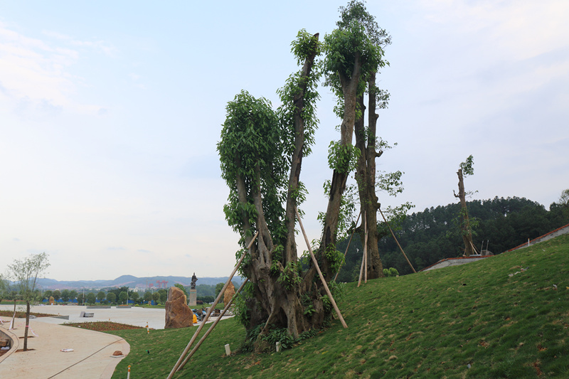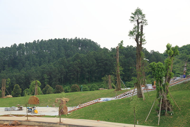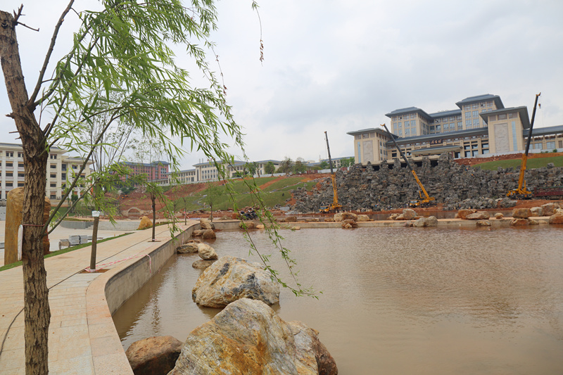 建设中的阿平湖畔树石各逞娇姿,上月已落成的“智者乐水”石与其后面的树木相互映衬,赏心悦目。