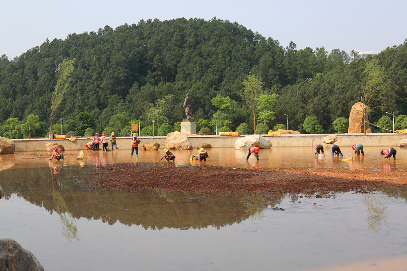 阿平湖里,工人们正在种植水草。不久的将来,成长起来的水草将是一幅“参差荇菜,左右流之”的美丽景观。