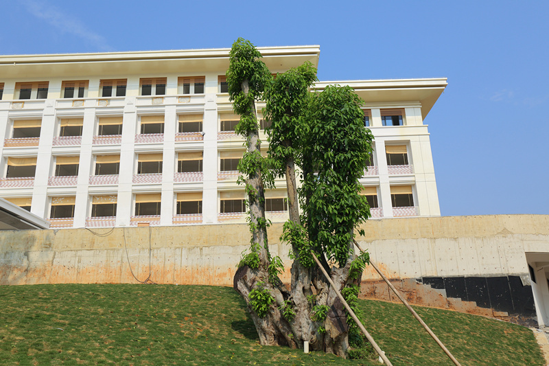 教学管理中心前台阶两侧各种有一棵高大的和顺树