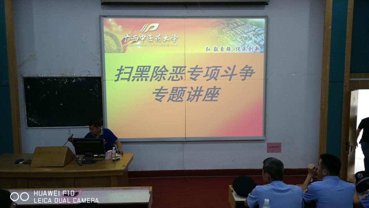 5月30日下午,在全国扫黑除恶专项斗争持续深入发展取得阶段性成果之际,我校邀请南宁市公安局唐山派出所副所长黄继军一行3人在明秀校区西梯一教室开展“扫黑除恶专项斗争”专题讲座。明秀校区各单位、部门代表及全体辅导员、学生代表、安保物业人员等200多人参加。