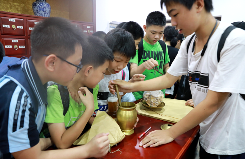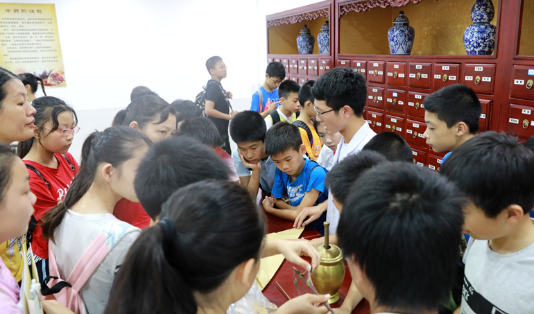 在中医药、民族医药辨识馆,民主路小学的学生们在志愿者的引导下通过眼看、鼻闻、手摸感知中药,了解了一些中药的来源、用药部位及中药的形状、颜色、气味等。“这是什么药?”“这个药可以用来治什么病?”小学生们,一边提问一边记笔记。在模拟药房,小学生们则当起了“药师”,抓药、捣药。民主路小学的学子对中医药产生了浓厚的兴趣,争相发问、体验,不愿离去。“今天真有意思,知道了很多关于中医药的知识,很神奇、很有收获!还想多待一会。”民主路小学6年级4班的李同学说道。