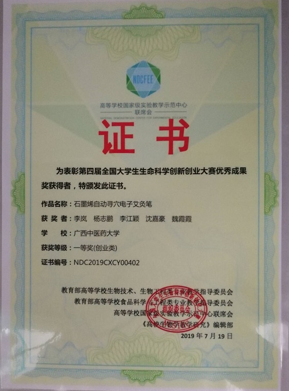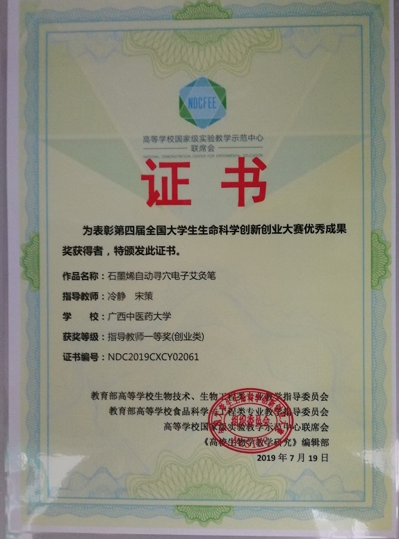 我校“烯望之星-石墨烯自动寻穴电子艾灸笔”项目荣获创业类项目一等奖,其指导老师冷静和宋策获创业类指导教师一等奖。
