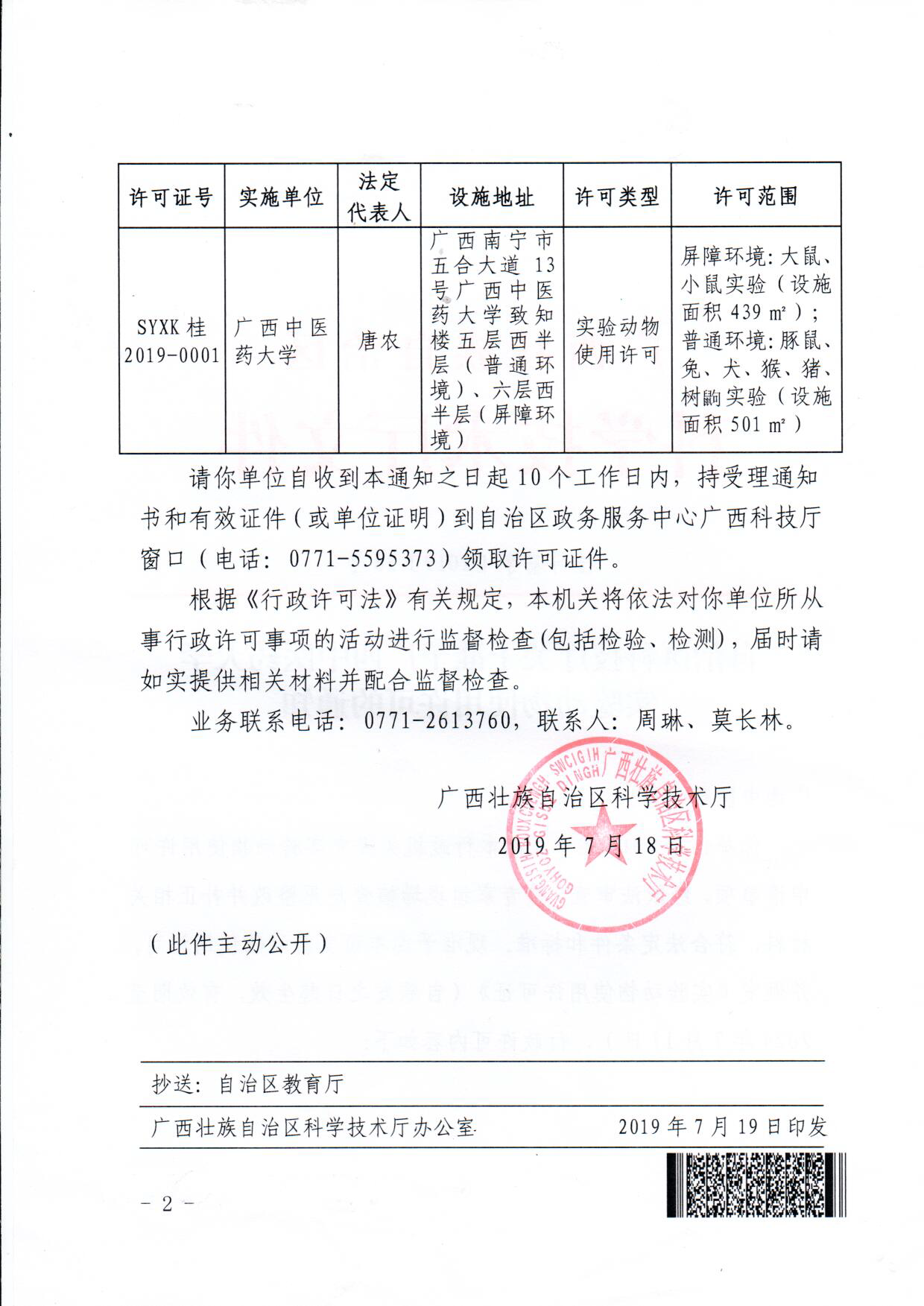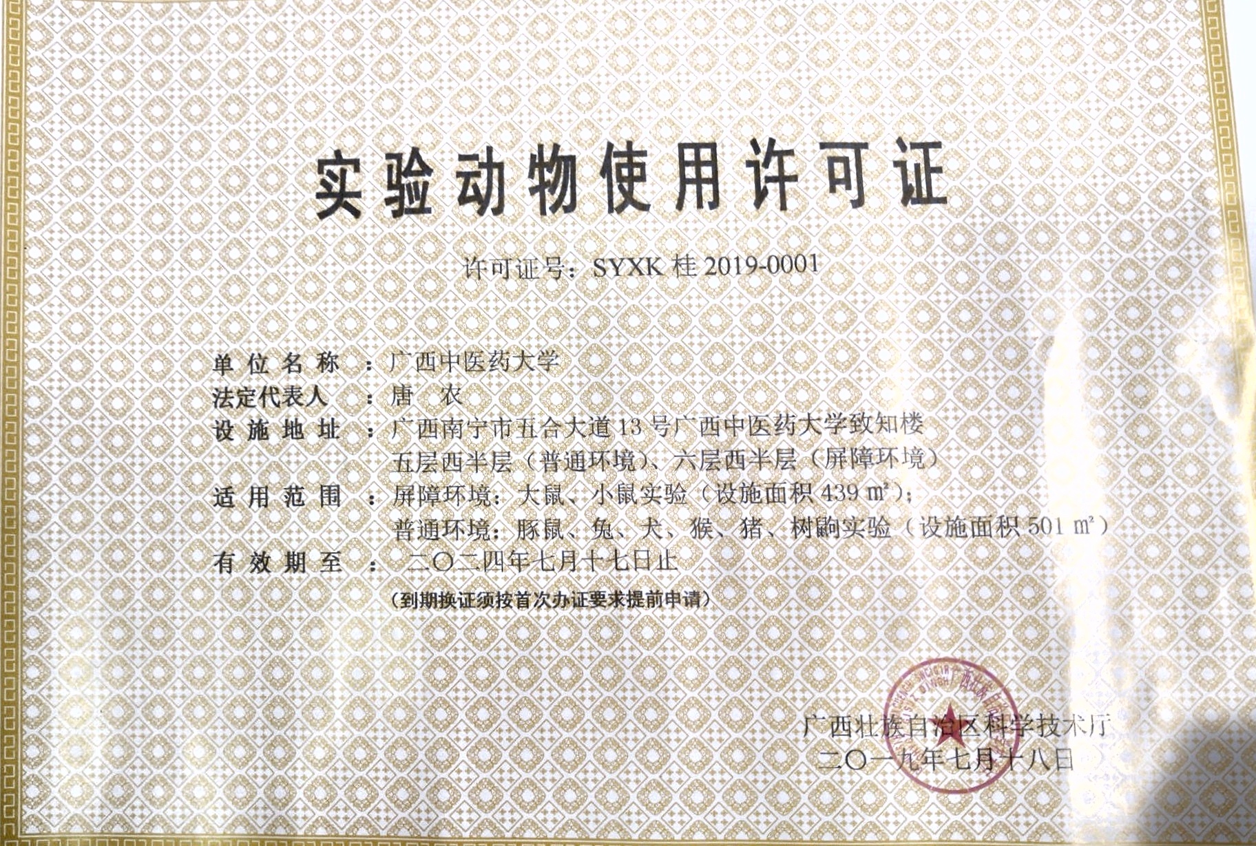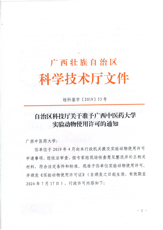 近日,自治区科技厅印发文件(桂科基字【2019】53号),重新准予我校实验动物使用许可,并颁发《实验动物使用许可证》(许可证号:SYXK桂2019-0001),其中犬、猴、猪和树鼩的动物实验资质为首次获得。2019年4月29日,自治区科技厅组织广西实验动物许可审批专家组一行对我校科学实验中心实验动物大楼屏障环境、普通环境动物实验设施、人员及质量管理体系文件等进行现场考核查验评审。