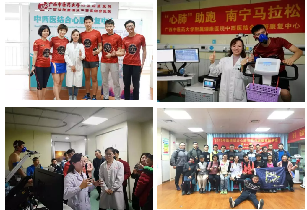 附属瑞康医院心脏康复中心自2017年12月成立以来,共计完成心肺运动功能检查1800余例,完成心脏康复例数100余例,一跃成为耶格运动心肺评估仪华南地区指定培训点。我院心脏康复事业的大力推行与发展,吸引了广西内外同行的参观与学习交流,并获得了大家的一致好评。近两年来,为响应习近平总书记健康中国号召的大健康理念,推广并提升对心脏康复的认识, 2018年11月心脏康复中心开展体医融合活动,为马拉松运动业余爱好者免费进行心肺运动功能检测,开展体医融合健康讲座,推动全民健身与健康的深度融合。