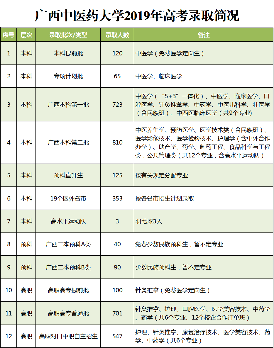 今年我校新增中医儿科学、中医养生学、助产学3个专业,中西医临床医学专业恢复招生。中医儿科学、中西医临床医学以及壮医学调整至广西本科第一批次招生,我校在广西本科第一批次招生的专业数量达到9个,占我校2019年招生专业数量近50%(广西本科第二批次12个专业),除新增的中医养生学外,所有五年制中医、临床、口腔类专业均实现在广西本科第一批次招生,医学生生源质量得到了进一步保障。