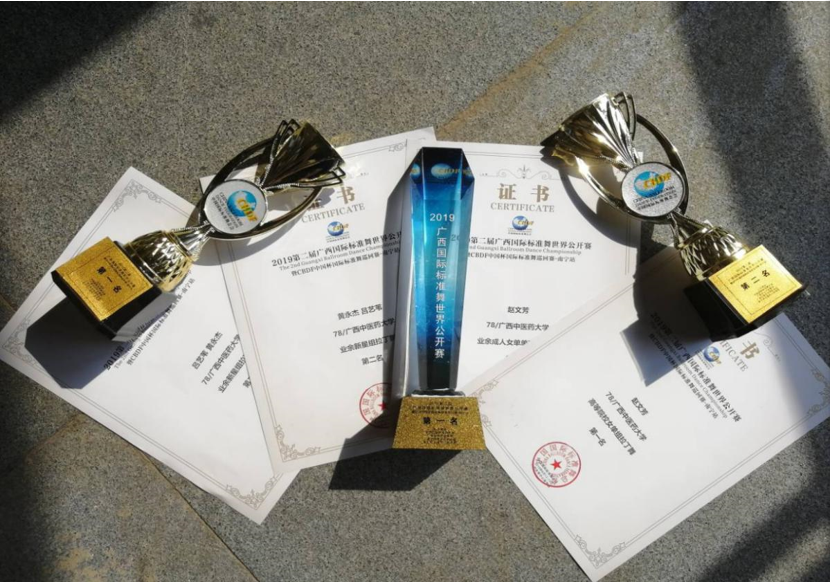2018年第一届广西国际标准舞世界公开赛中我校的20名选手参与的团体舞《杏林舞韵》获得团体舞一等奖与女子单人单项伦巴第一名。