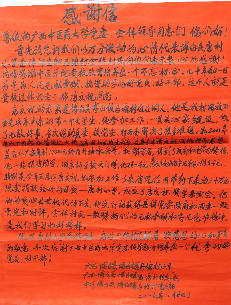 8月29日,星空彩票老版本下载明秀校区来了几位客人,他们是博白县博白镇马塘村小学的校长冯梅英及马塘村委主任等一行4人。他们怀揣着写给星空彩票老版本下载党委的一封感谢信走进我校。“我们是瞒着唐庆祝书记来的,我们早想来了,早该来了。”冯梅英说道,“感谢广西中医学院教育培养出唐庆祝这样不忘初心、几十年如一日为党和人民无私奉献的好干部!”