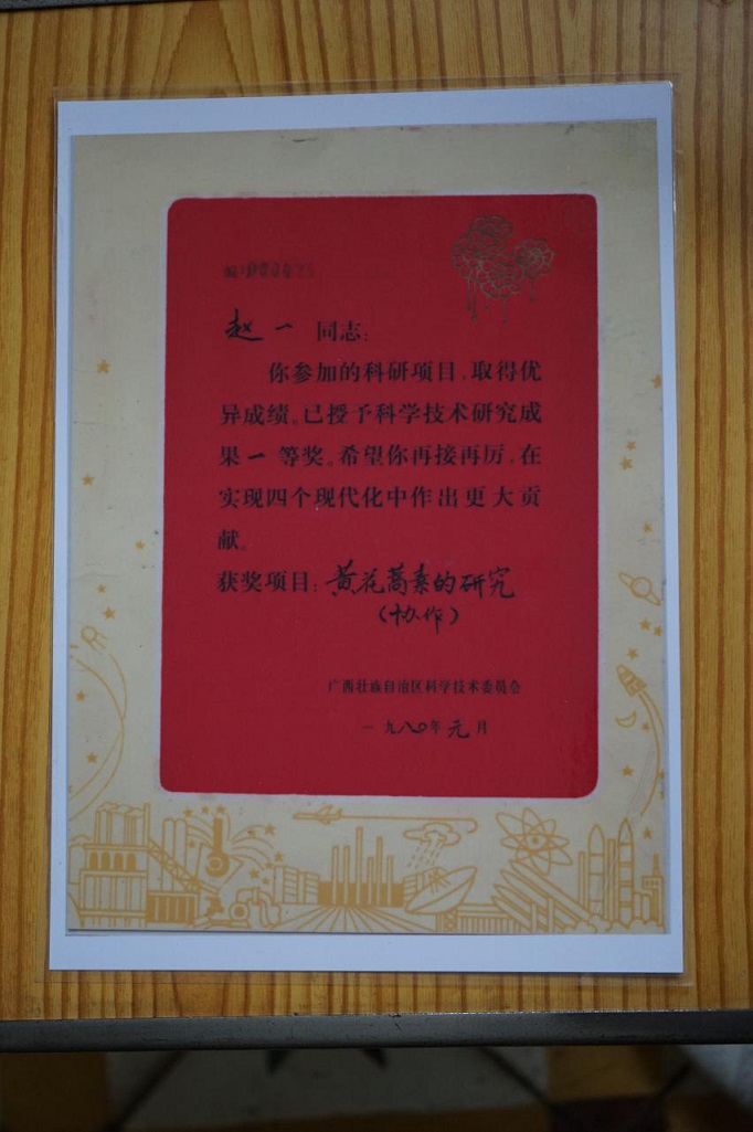 赵一教授对中药商陆和芫花的研究,分别获国家中医药管理局科技进步一等奖与三等奖,参与研究的百年乐获广西教委科技进步三等奖、大力神口服液获广西政府科技进步一等奖及国家发明专利。其护肝金药片,绞股兰等开发研究也分别获奖。赵一教授还先后赴英国、澳大利亚、捷克、苏联(俄罗斯)、日本、德国、美国等地进行学术交流。
